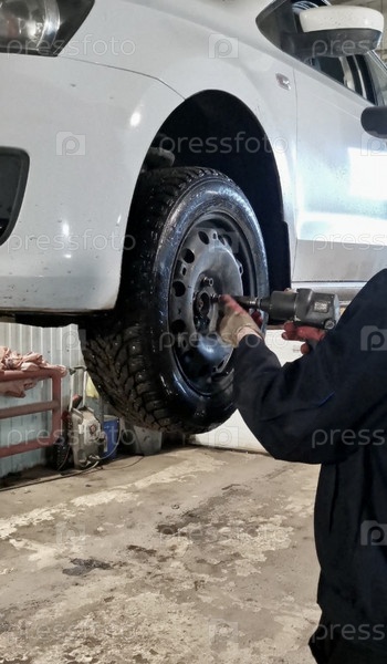 Крупный план рук автомеханика, меняющего колесо на белом автомобиле, подвешенном на автоподъемнике, аутентичный, реальность, настоящая жизнь