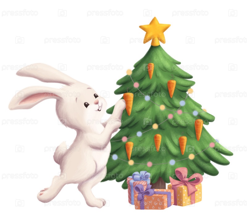 Кролик наряжает елку на новый год рисунок