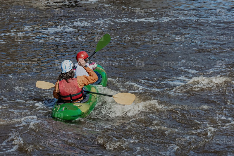 Серия изображений. Спортсмены на байдарках и байдарках покоряют бурные воды реки. Одет в водонепроницаемую одежду и шлемы. В руках они держат весло. Размытость