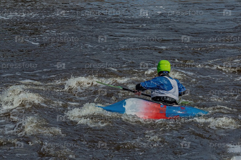 Серия изображений. Спортсмены на байдарках и байдарках покоряют бурные воды реки. Одет в водонепроницаемую одежду и шлемы. В руках они держат весло. Размытость