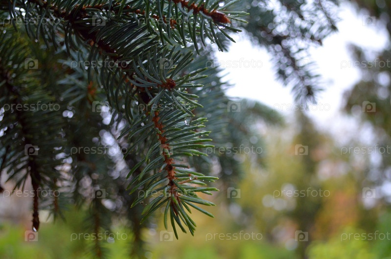 еловые ветви с каплями дождя