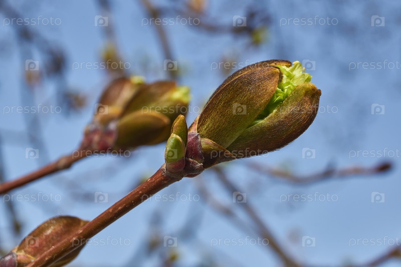 Растворяются цветочные почки остролистного клёна (лат. Acer platanoides). Деревянный вид растения рода Асер семейства Сапиндовых