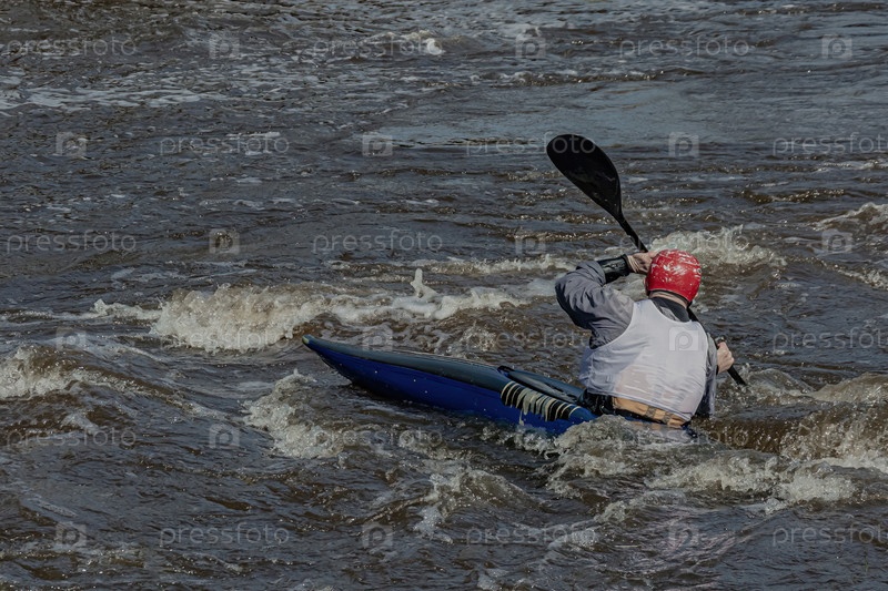 Серия изображений. Спортсмены на байдарках и байдарках покоряют бурные воды реки. Одет в водонепроницаемую одежду и шлемы. В руках они держат весло. Размытость