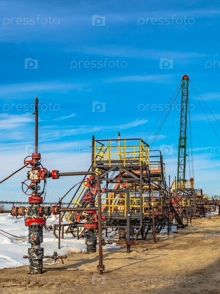 Нефтяное месторождение в Сибири. В ряду расположены нефтедобывающие скважины. На заднем плане ведутся работы по капитальному ремонту скважины. Весна. На земле остатки снега