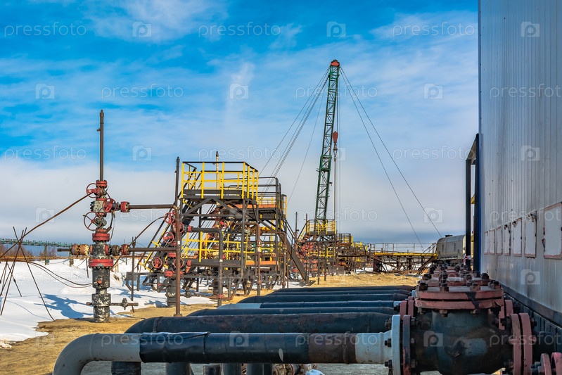 Нефтяное месторождение в Сибири. В ряд идут нефтедобывающие скважины. На заднем плане ведутся работы по капитальному ремонту скважины. На переднем плане коллектор с клапанами