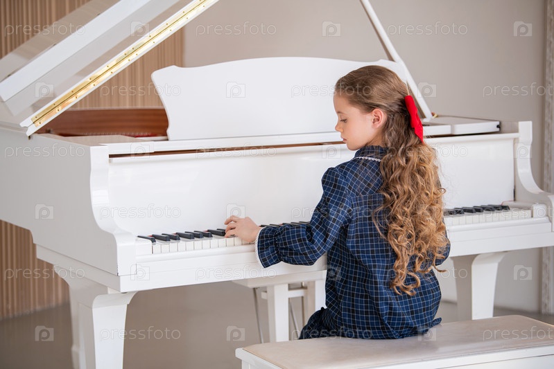 Девушка сидит за фортепиано и играет песню