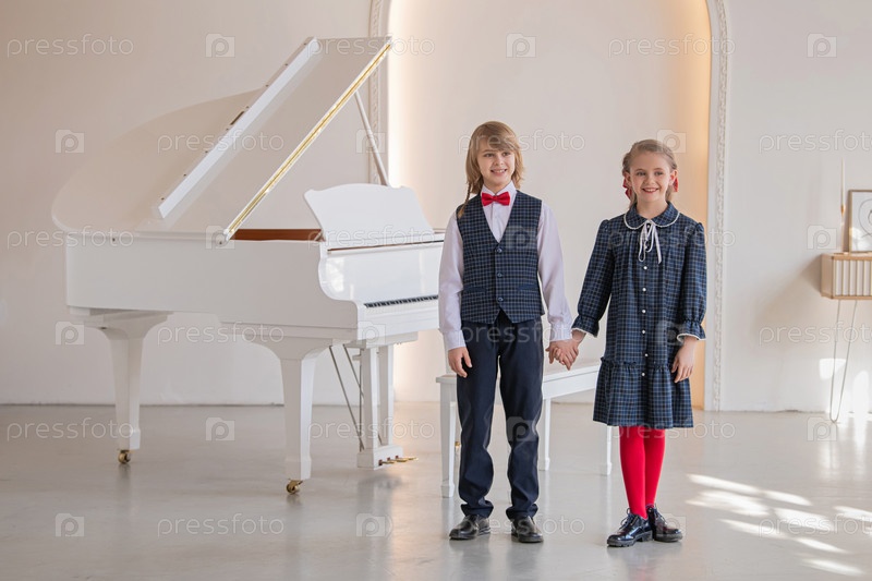 Двое детей поют перед фортепиано