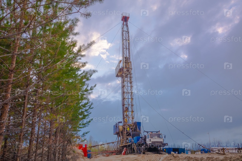 Бурение глубокой скважины мобильной буровой установкой на месторождении нефти и газа. Месторождение расположено на Крайнем Севере в тайге. Красивое драматическое закатное небо на заднем плане