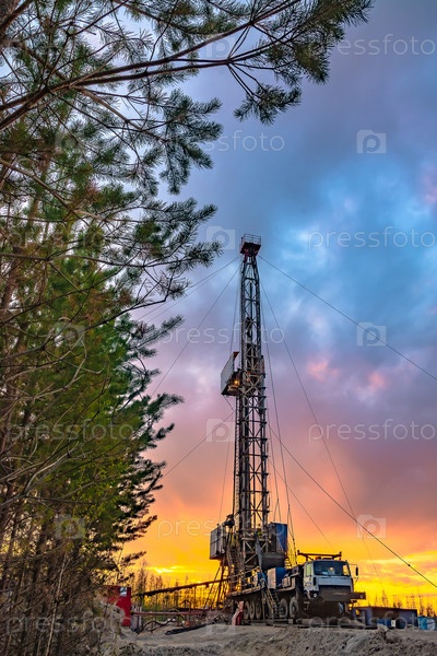 Бурение глубокой скважины мобильной буровой установкой на месторождении нефти и газа. Месторождение расположено на Крайнем Севере в тайге. Красивое драматическое закатное небо на заднем плане