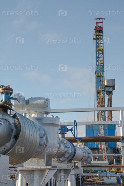 Оборудование и инфраструктура для добычи газа из скважин арктического месторождения. Зимний полярный день. Буровая установка на заднем плане