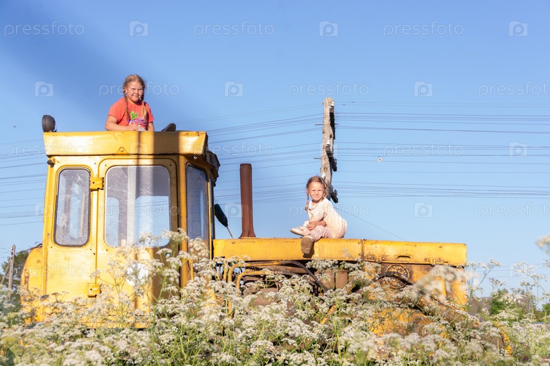 Советский сельскохозяйственный и промышленный гусеничный трактор, выпускавшийся Челябинским тракторным заводом Children climb on the tractor CHTZ-URALTRAK T-130