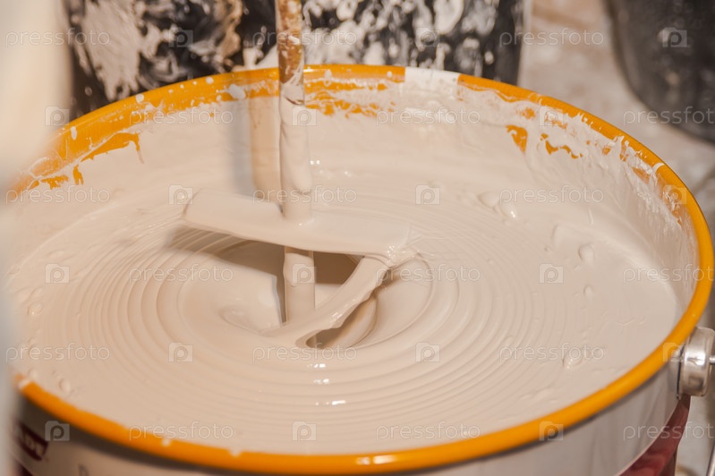 Перемешивание краски в ведре перед покраской