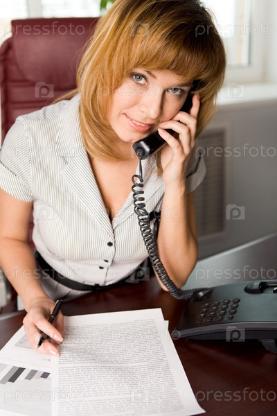 Портрет о прекрасной деловой леди, которая звонит по телефону в офисе и смотрит на камеру