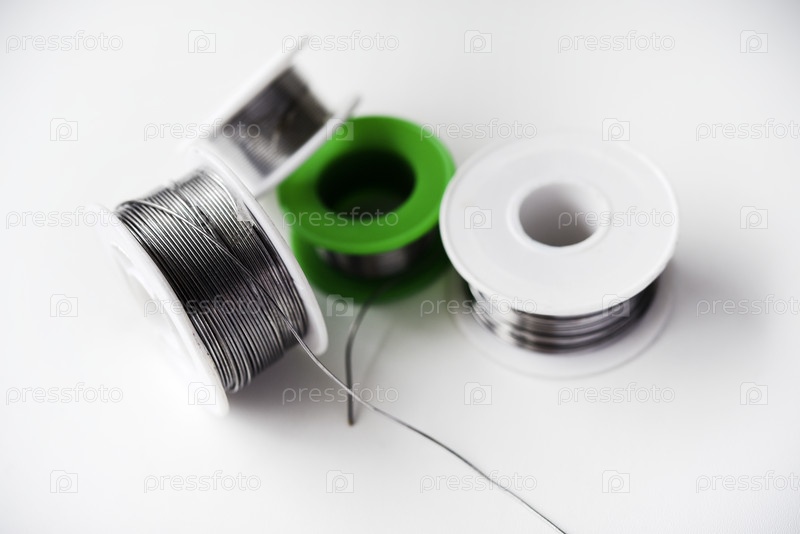 Оловянно-свинцовый припой в катушках на белом фоне. Материалы для пайки