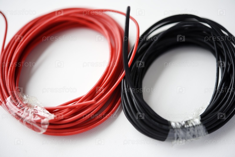Провода для электроники на белом фоне. Две катушки красного и черного проводов