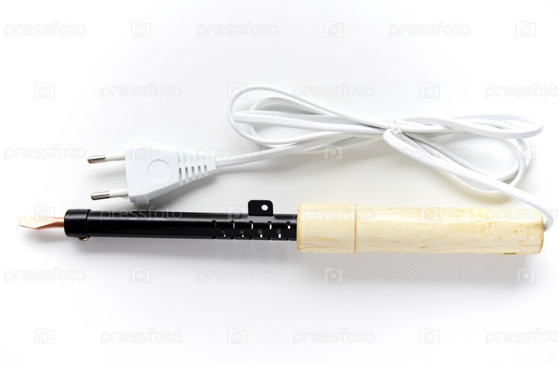 Электрический паяльник с деревянной ручкой на белом фоне. Инструмент для пайки радиодеталей