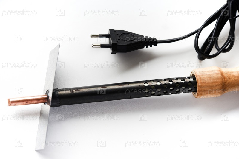 Электрический паяльник с деревянной ручкой на белом фоне. Инструмент для пайки радиодеталей