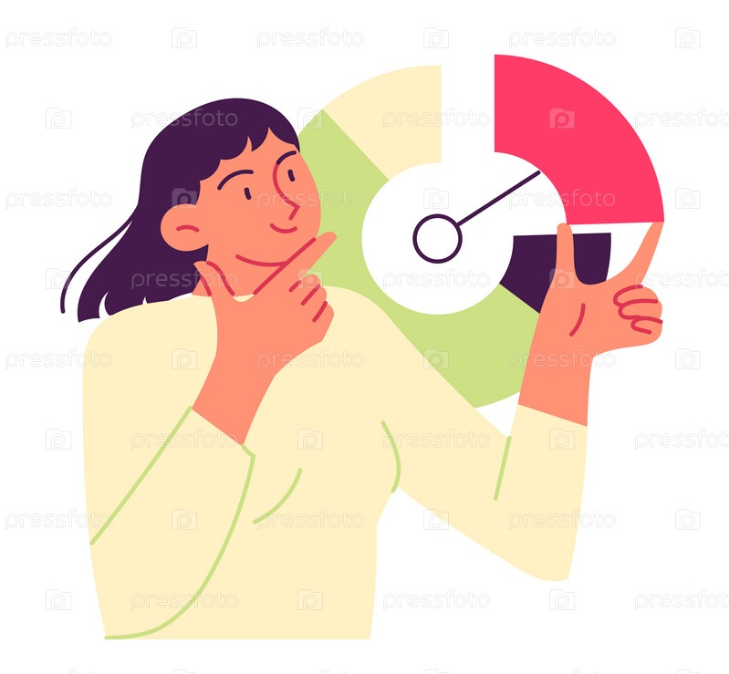 Женщина держит диаграмму с часами, оценивает доли диаграммы