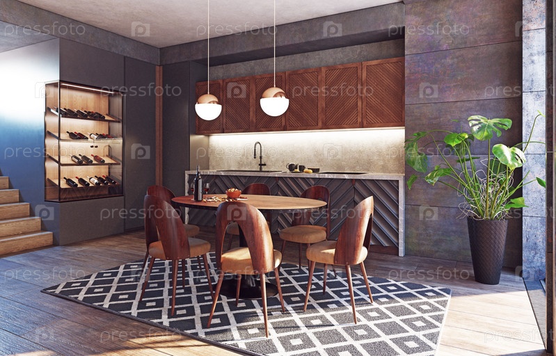 Концепция дизайна интерьера современной кухни.Идея 3D-рендеринга
