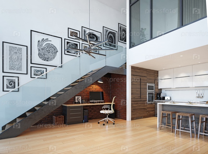 Современный интерьер домашнего офиса. Концепция дизайна 3D-рендеринга