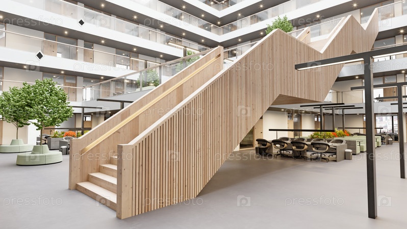 3D-рендеринг интерьера современного офисного здания с лестницей