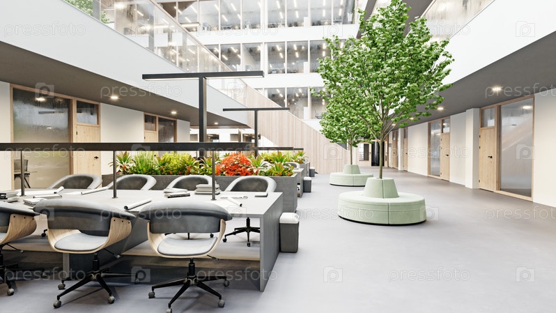 Интерьер современного офисного здания. макет 3D-рендеринга