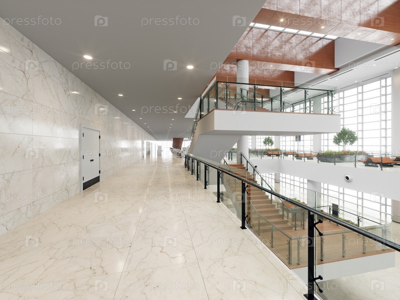 3D-рендеринг интерьера современного офисного здания со ступенями и растениями