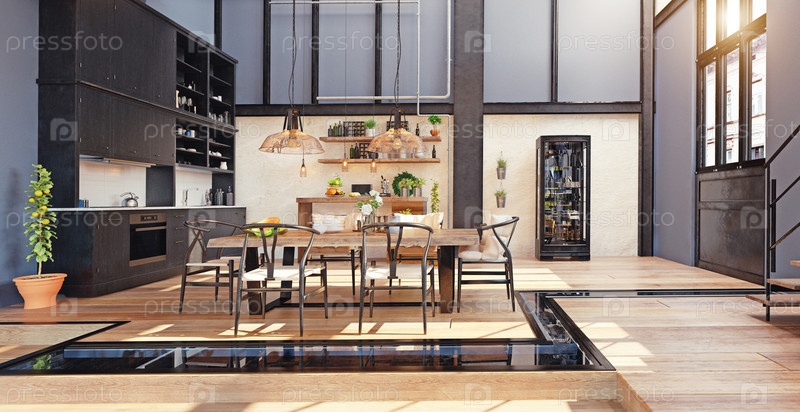 Современный интерьер домашней кухни. Концепция дизайна 3D-рендеринга