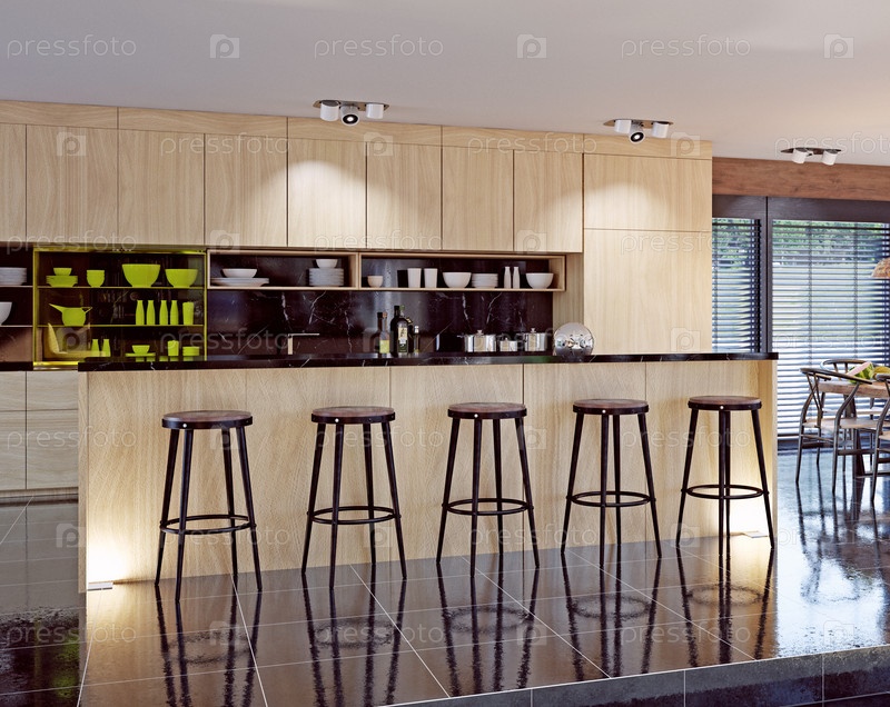 Современный интерьер домашней кухни. Концепция дизайна 3D-рендеринга