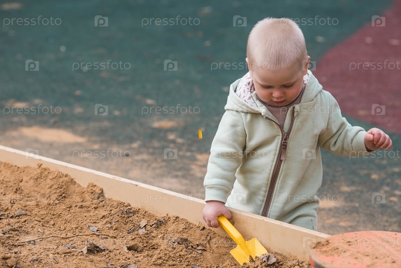 Красивый, веселый маленький мальчик двух лет гуляет весной на детской площадке. Ребенок играет лопаткой в песочнице. Концепция родительства, счастливого детства и семьи