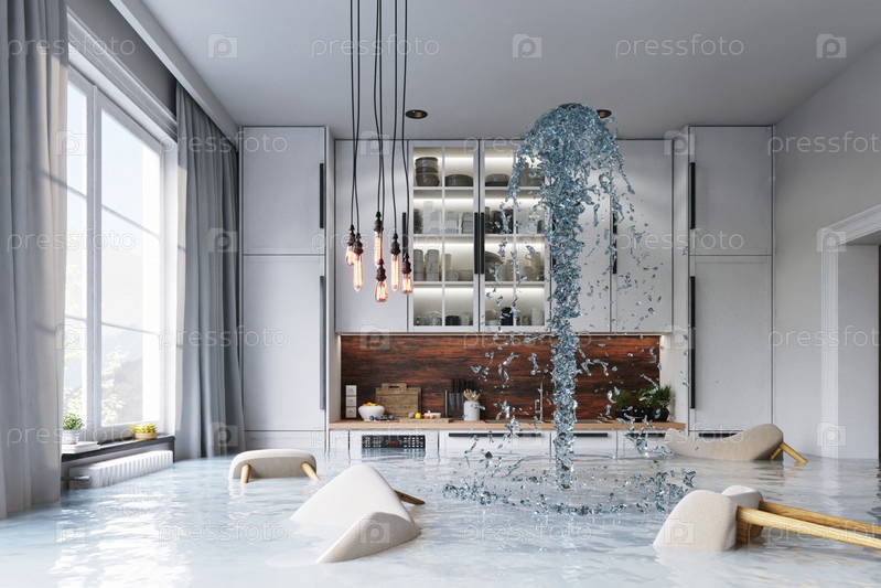Наводненный пол на кухне от утечки воды. 3D-рендеринг