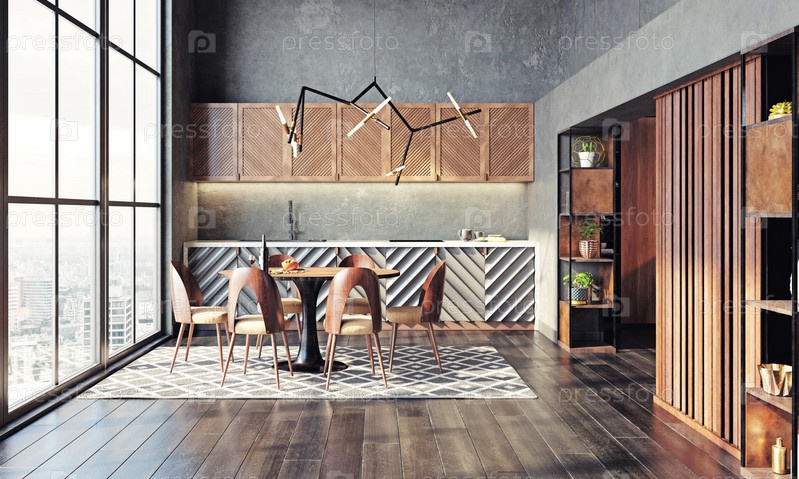 Концепция дизайна интерьера современной кухни.Идея 3D-рендеринга