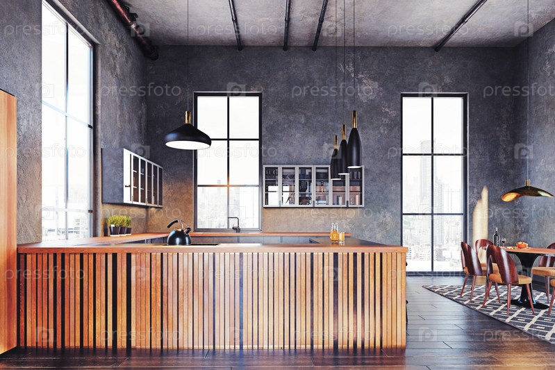 Концепция дизайна интерьера современной кухни.Идея 3D-рендеринга