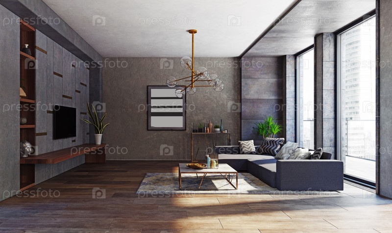 Современный интерьер гостиной квартиры. Концепция дизайна 3D-рендеринга