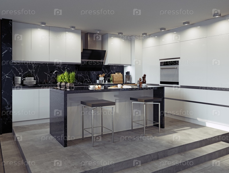 Современный интерьер кухни. концепция 3D-рендеринга