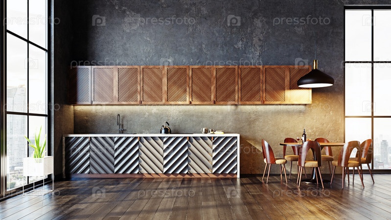 Концепция дизайна интерьера современной кухни.Идея 3D-рендеринга