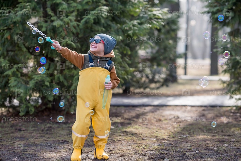 Весенний день веселый маленький мальчик в модных желтых резиновых штанах, солнцезащитных очках и желтых резиновых сапогах играет с мыльными пузырями. Ребенок на свежем воздухе, на природе. Концепция счастливого детства и праздника