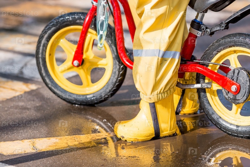 Веселый маленький мальчик катается на велосипеде по лужам. Весной счастливый ребенок выходит на улицу. На ребенке желтые резиновые штаны, солнцезащитные очки и желтые резиновые сапоги