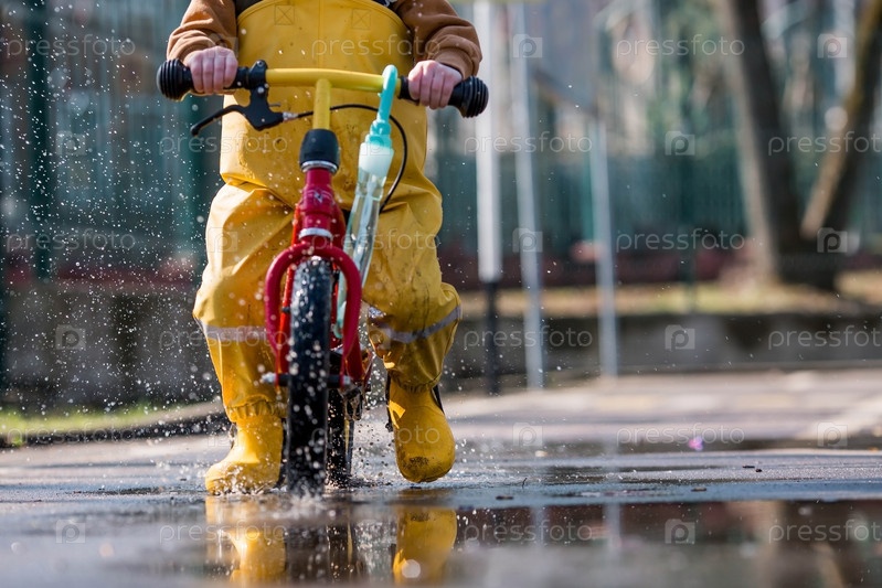 Веселый маленький мальчик катается на велосипеде по лужам. Весной счастливый ребенок выходит на улицу. На ребенке желтые резиновые штаны, солнцезащитные очки и желтые резиновые сапоги