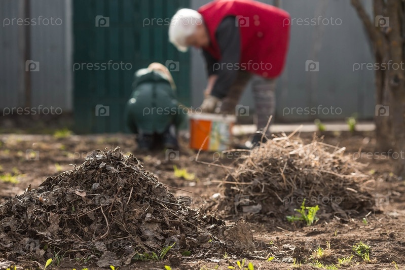 Санитарный день ранней весной. В центре внимания груды старых листьев на переднем плане. На заднем плане женщина и ребенок делают генеральную уборку в саду. Весной люди очищают газон от сухих листьев. Садоводство. Уборка сада