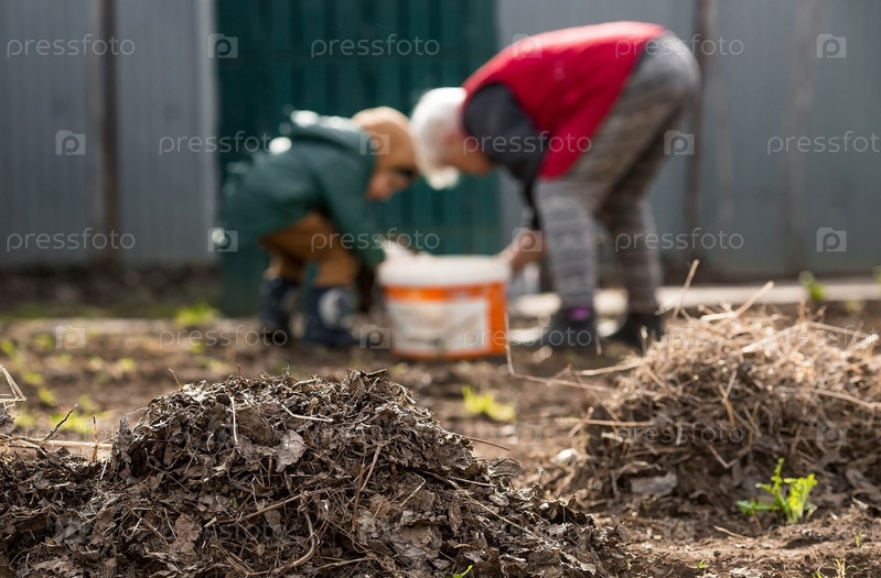Санитарный день ранней весной. В центре внимания груды старых листьев на переднем плане. На заднем плане женщина и ребенок делают генеральную уборку в саду. Весной люди очищают газон от сухих листьев. Садоводство. Уборка сада
