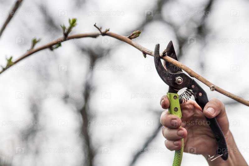 Весенние работы в саду. Рука садовника с секатором. Обрезка кустов малины и ежевики секатором. Дача и огород, садоводство, уход за кустарниками