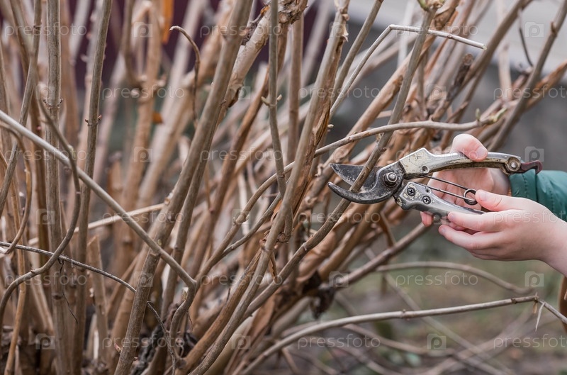Весенние работы в саду. Садовники держат в руках секатор. Обрезка кустов гортензии секатором. Дача и сад, садоводство, уход за цветами