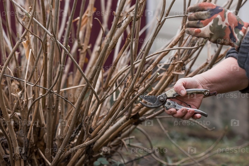 Весенние работы в саду. Садовники держат в руках секатор. Обрезка кустов гортензии секатором. Дача и сад, садоводство, уход за цветами