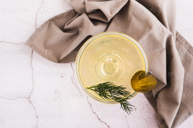 Крупным планом модный коктейль мартини с солеными огурцами и укропом в стакане на столе