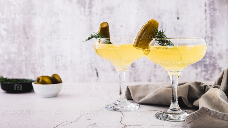 Модные коктейли мартини с солеными огурцами и укропом в стаканах на веб-баннере стола