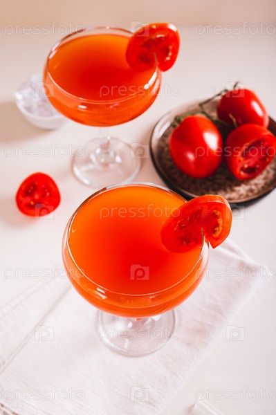 Оригинальный томатный коктейль мартини в стаканах и помидорах на тарелке на столе, вертикальный вид