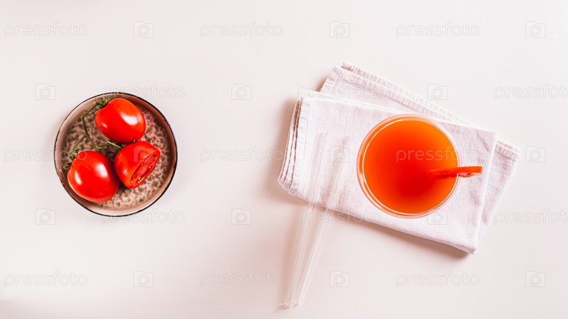 Оригинальный томатный коктейль мартини в стаканах и помидорах на тарелке, вид сверху, веб-баннер