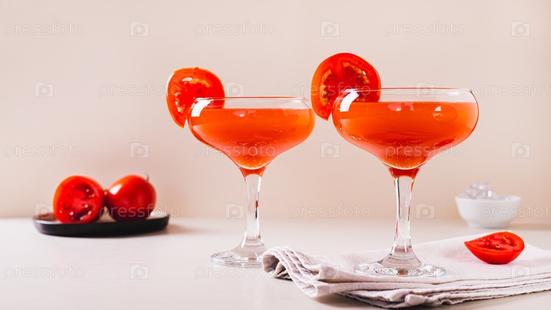 Модный томатный коктейль мартини в стаканах на веб-баннере стола
