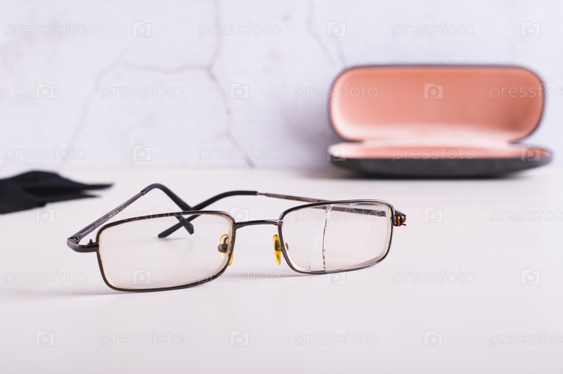 Старые сломанные очки на столе на фоне открытого жесткого футляра